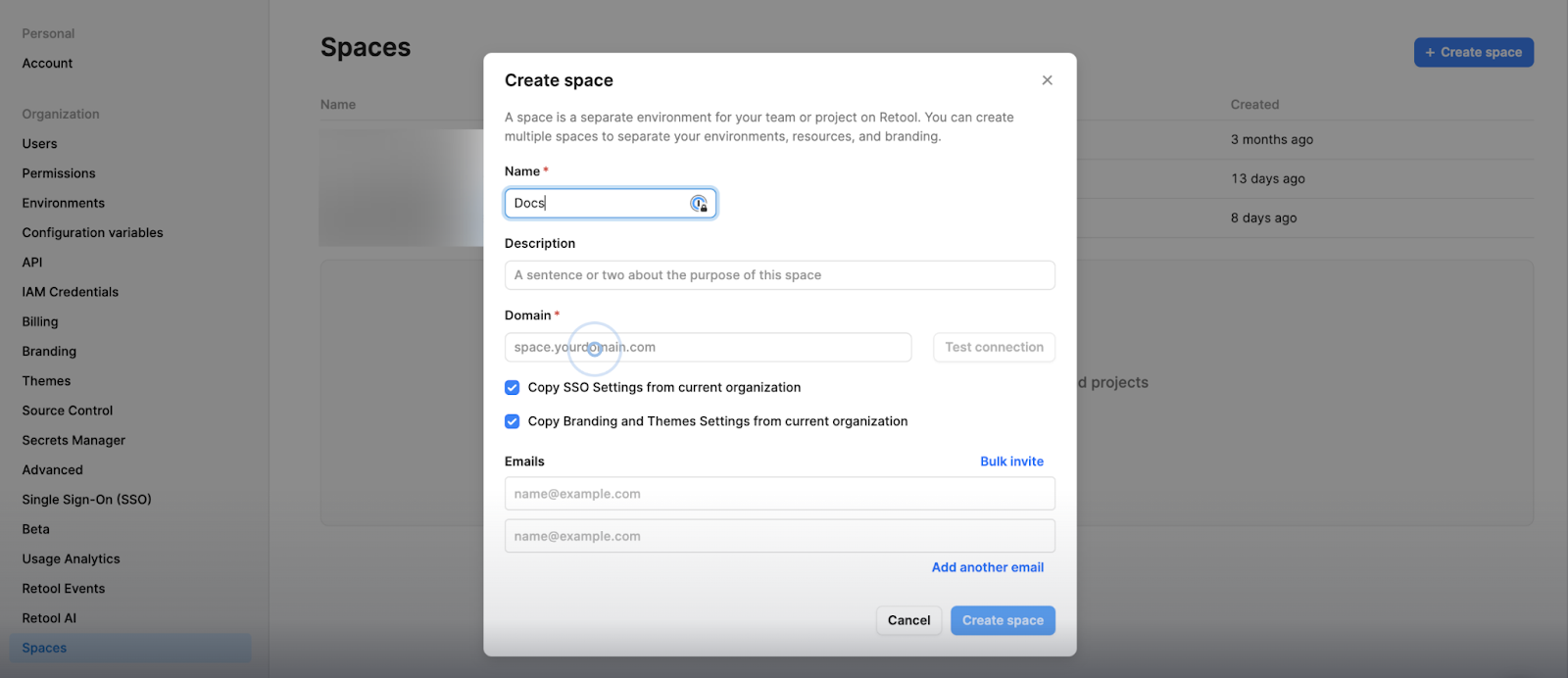 If you haven’t yet set up Spaces, follow the steps in the Retool Spaces docs to configure them.