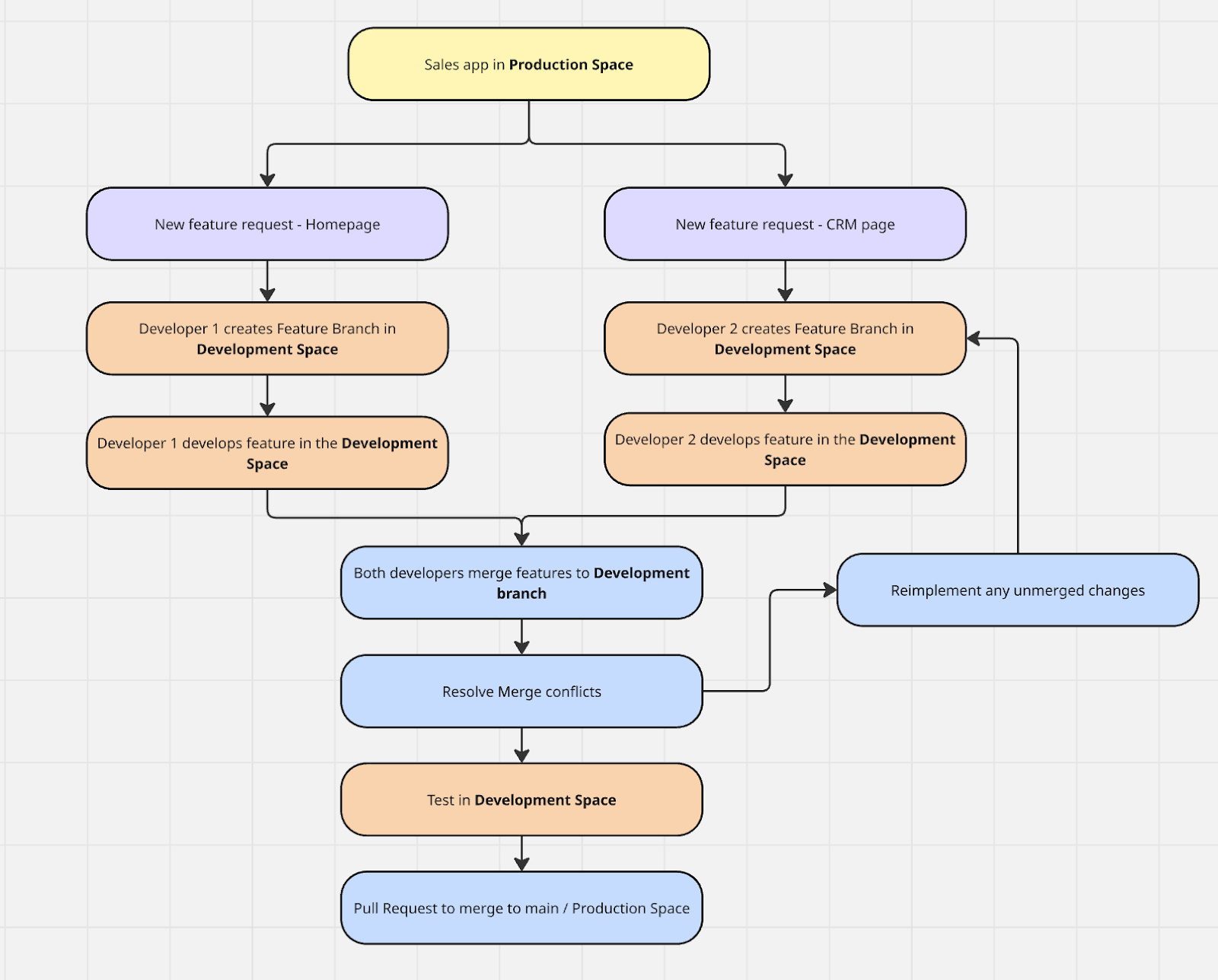 - After completing a feature or getting to a good point for you to test your work, merge the branch back into the Development Branch. This allows you to safely test the new feature in the Development environment, before pushing it to the ‘main’ branch in your Production Space.