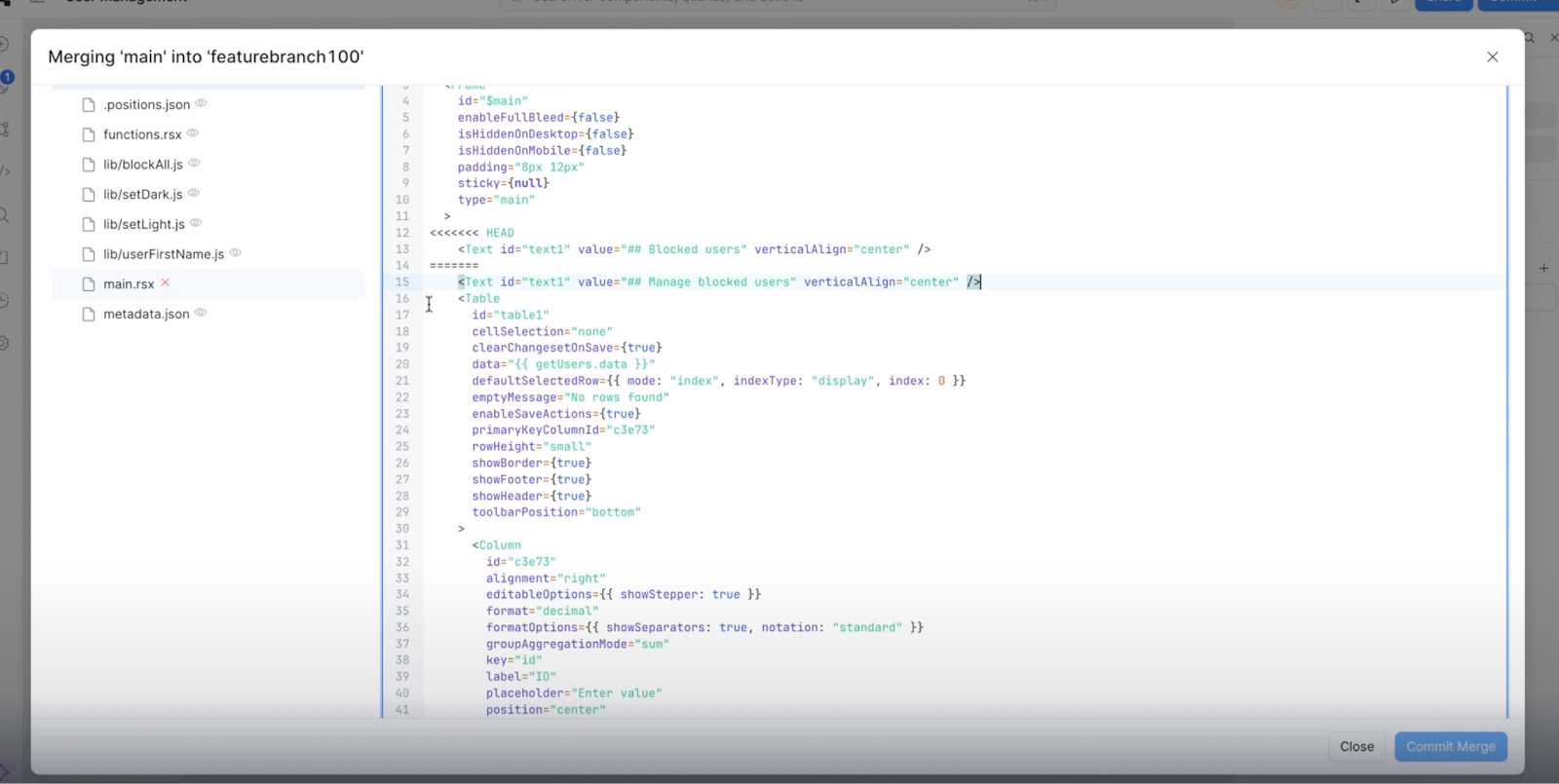- Handle any conflicts and complete the merge. If Retool finds any conflicts, you can use the code editor to resolve them.