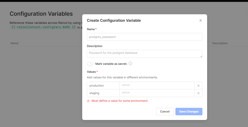 - Configuration variables are specific to the Retool Space, meaning the same variable can have a different value in the Development Space than it does in the Production Space.
